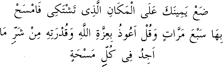 “Sağ elini vücudunda rahatsız olduğun mahalle koyup yedi defa mesh eyle ve her meshde: “Hissettiğim bu hastalığın şerrinden Allah’ın izzetine ve kudretine sığınırım!” de. Biiznillah Teâlâ şifâ bulursun.” (12)